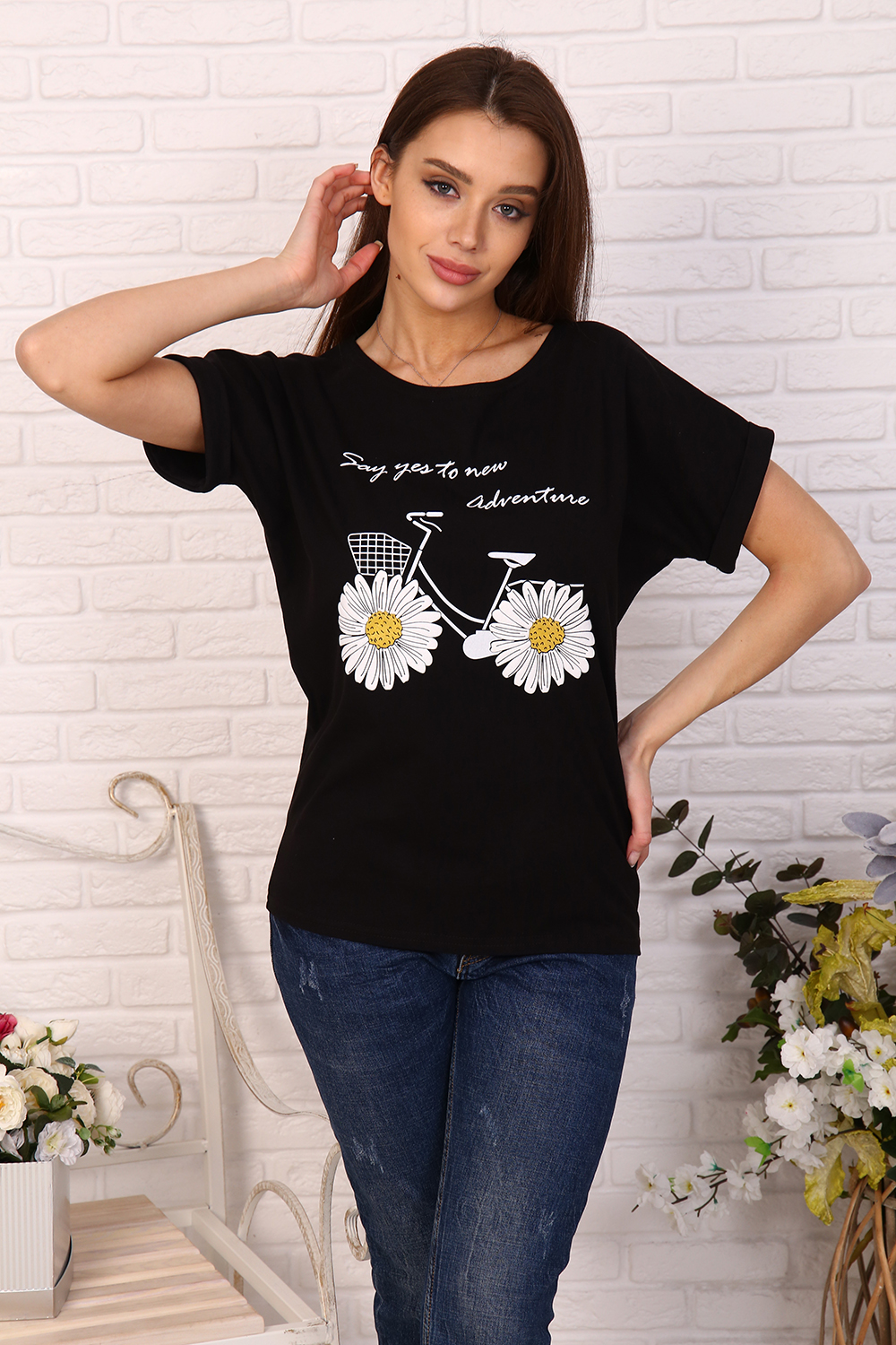 Футболка женская с принтом - ромашки в виде велосипеда, из кулирки с лайкрой качества ПЕНЬЕ. Модель свободного покроя, вырез горловины в виде лодочки, спущенная пройма обработана манжетом с отворотом. Футболка приятная к телу, комфортная, подойдёт на любую фигуру.