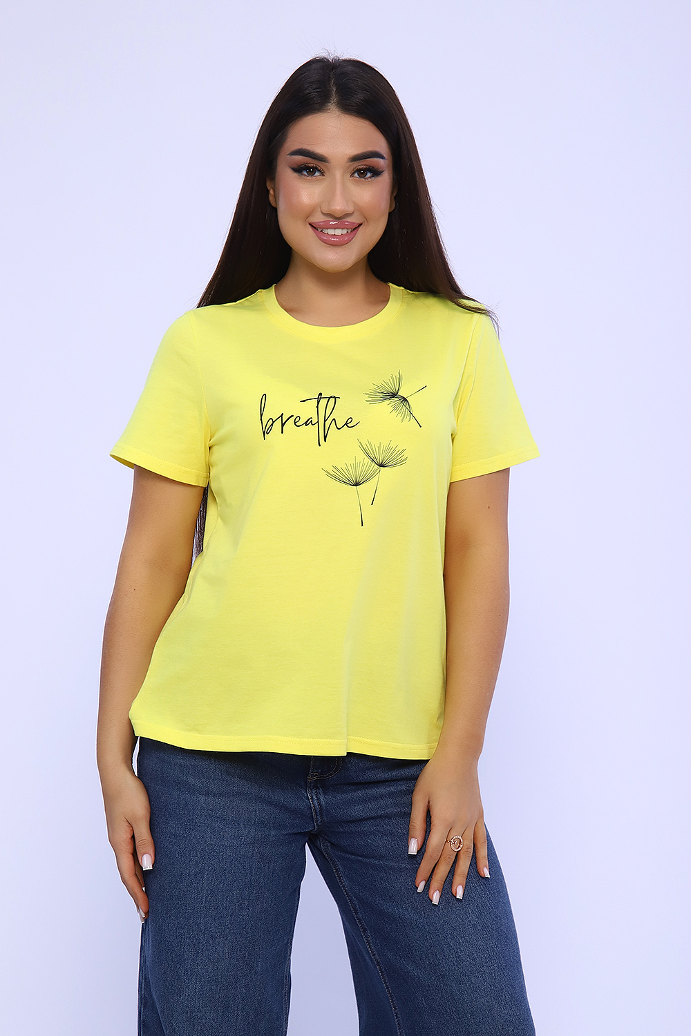 Женская футболка с коротким рукавом полуприлегающего силуэта, с округлой горловиной, на полочке неброский принт.