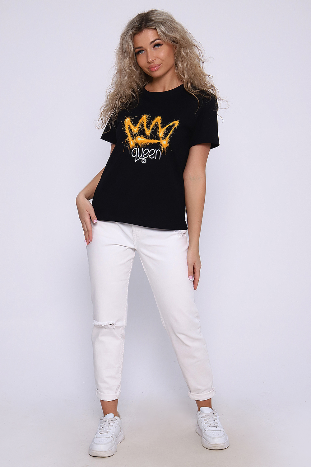 Футболка классического фасона, прямого кроя, с коротким рукавом и округлым вырезом. Декорирована принтом. Универсальная модель футболки отлично подойдет для любого образа и станет необходимой вещью в вашем гардеробе. Ткань кулирка пенье, плотность 160 г.