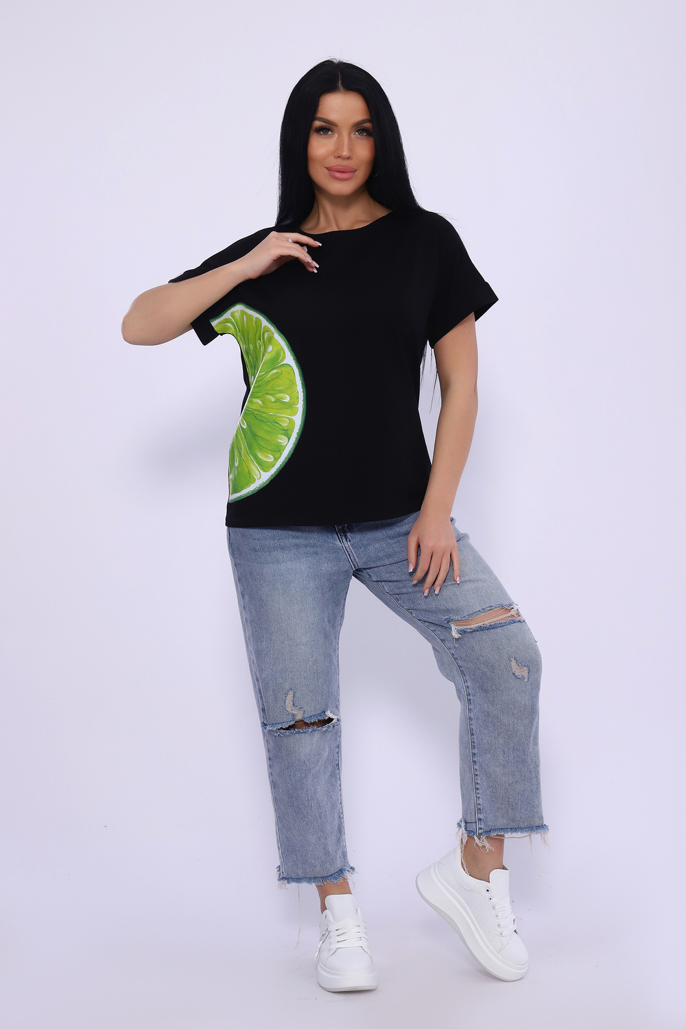 Футболка женская с ярким 3-Д принтом, из кулирки высокого качества пенье компакт. Модель свободного кроя, горловина в виде лодочки, спущенная пройма на манжете. Стильная, приятная к телу из 100% хлопка футболка необходимая вещь в гардеробе современной девушки.