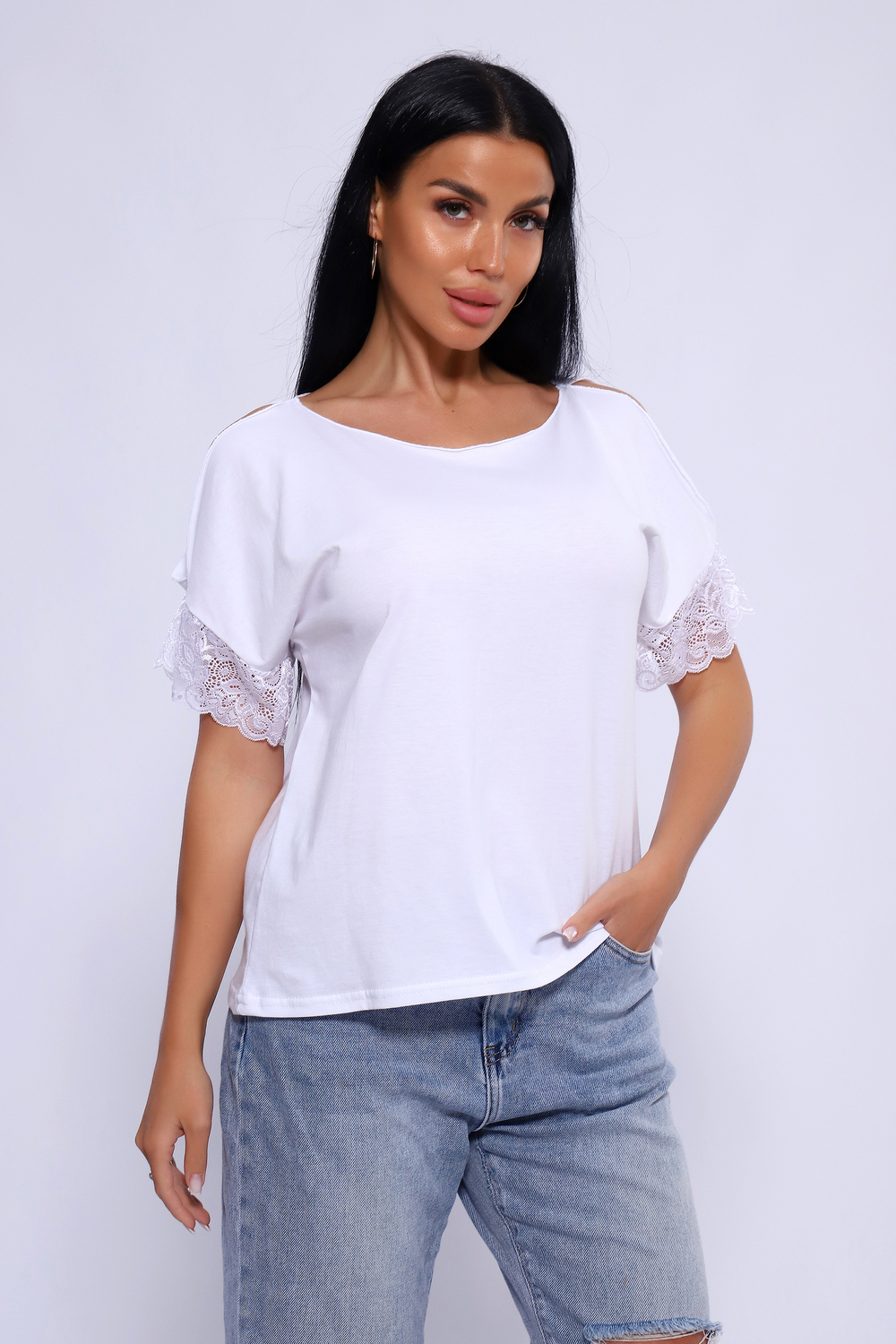 Футболка женская из гипоаллергенного хлопкового трикотажа - кулирки высокого качества пенье компакт. Модель слегка приталенного силуэта, горловина и спущенная пройма обработаны краёвкой, что придаёт футболке некую изюминку и индивидуальность. Пройма обработана широким, жаккардовым кружевом в виде короткого рукава. Стильная, комфортная футболка необходимая вещь для модницы любого возраста и фигуры, подойдет как для офисного гардероба так и для отдыха, активного занятия спортом.