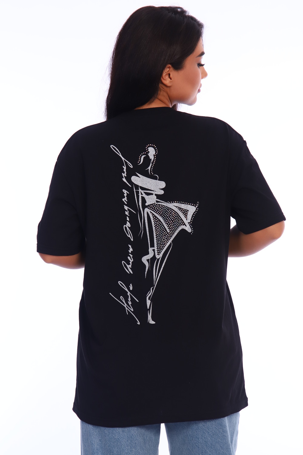 Женская футболка свободного кроя оверсайз в классических цветах - белом и черном. Она идеально подойдет для размеров 42 до 60 благодаря своей универсальности. На спинке футболки расположен рисунок, украшенный стразами, придавая изделию небольшую изюминку и делая его еще более интересным.
