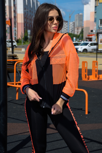 Комплект состоит из толстовки и майки. Толстовка прямая, свободная, с капюшоном из сетки, на молнии. Рукав длинный, из сетки, на эластичном манжете. Спинка удлиненная, из сетки. В верхней части полочки расположены кокетки из сетки. На полочку настрочены накладные карманы с клапанами из сетки. Майка на бретелях, полуприлегающая.