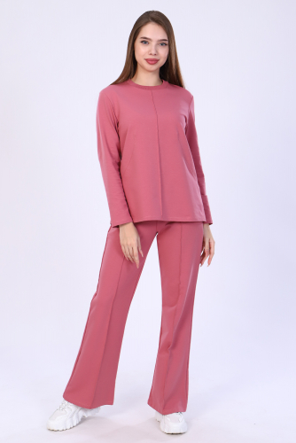 Женский костюм состоит из брюк и кофты - он прекрасно дополнит Вашу повседневную капсулу. Свободного покроя брюки, талия на резинке. Кофта свободного силуэта, втачной длинный рукав, круглый вырез горловины. Брюки палаццо подходят для любого типа фигуры, скрывают ее недостатки и подчеркивают достоинства. Костюм прекрасно подойдет под лаконичный офисный стиль, для вечерних и повседневных образов. Такой фасон может быть женственным и легким. Костюм выполнен из ткани футер 2-х нитка, не теряет форму после многочисленных стирок, не скатывается за счет полиэстера в составе. С чем одеть? С кроссовками, босоножками на платформе, а если добавить экстравагантные украшения, вы будете привлекать внимание в любой обстановки! (длина брюк по боковому шву + пояс).