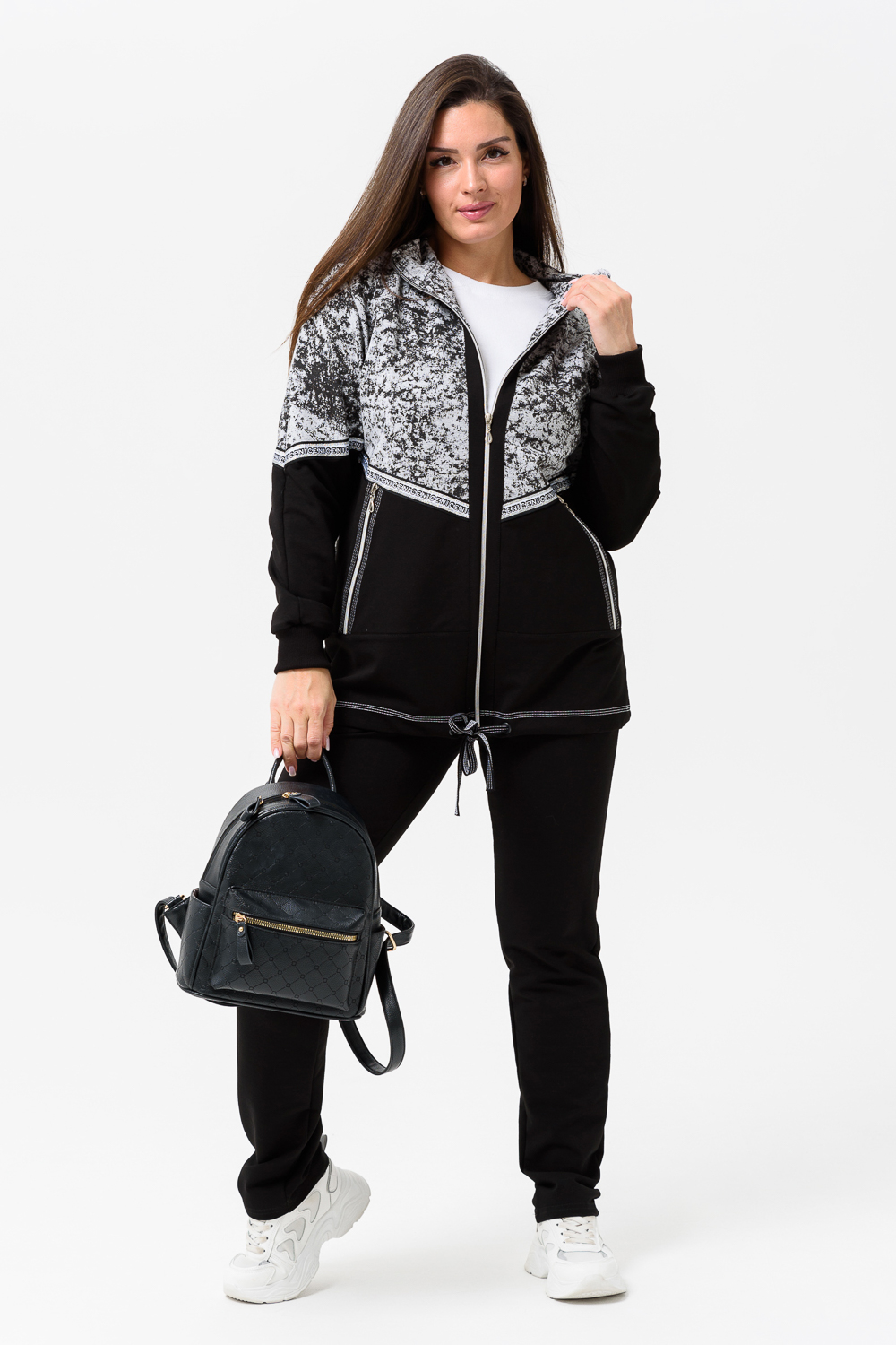 Костюм женский куртка и брюки. Куртка прямого силуэта с втачным рукавом на манжете из кашкорсе. Застежка на тесьму-молнию. Верхние части куртки и верхние части рукавов из набивной ткани с космическим принтом. Воротник-стойка. Нижняя часть полочки и спинки из однотонной ткани затягивается шнуром. На полочке карманы на молнии. Брюки прямые, слегка зауженные к низу