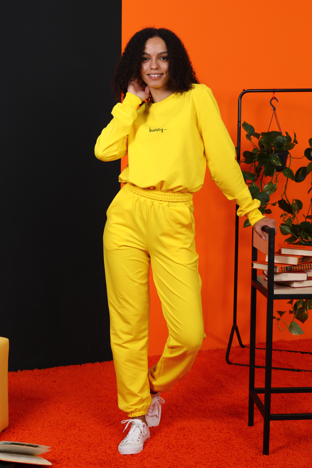 Костюм женский для повседневной носки. Данная модель выполнена из трикотажного полотна футер 2-х нитка. Толстовка с втачным рукавом. На полочке присутствует маленьким принт. Манжеты на рукавах и горловина выполнены из эластичного трикотажного полотна кашкорсе. Пояс на толстовке и брюках выполнены из основной ткани под поясную машинку (отделочная тройная строчка). Брюки имеют по бокам карманы, принт на задней детали. По низу брюк вшита резинка 2,5 см.