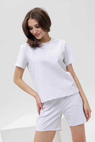 Женский костюм из футболки с шортами. Верх: однотонная футболка с коротким рукавом. Комфортная футболка для дома и занятий спортом. Актуальный крой и трендовые расцветки модели делают её универсальной для летнего гардероба. Низ: Шорты свободного покроя с карманами. Костюм спортивный в приятных модных расцветках. Комплект будет идеально смотреться как домашний и как спортивный на летний сезон. Костюм сшит из футера. Это износостойкая, приятная на ощупь, мягкая ткань из натурального хлопка. За ней легко ухаживать.