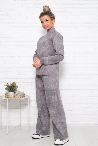 Костюм состоит из кофты и брюк. Кофта свободного кроя с длинными расклешенными рукавами. Брюки свободные прямые с карманами.