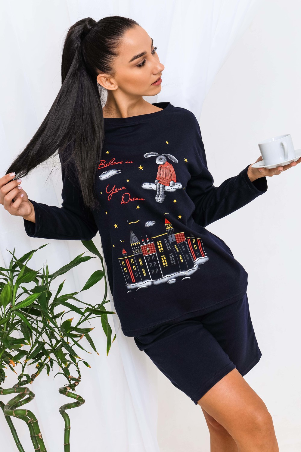 Домашний костюм, состоящий из лонгслива и удлинённых шорт. Костюм изготовлен из ткани высокого качества интерлока пенье. Пенье-это полотно, при производстве которого используют самые лучшие длинные нити. На интерлоке пенье не образовывается затяжек, катышков и прочих неприятностей, эта ткань всегда выглядит безупречно. Мягкий натуральный хлопок гипоаллергенен, не раздражает кожу и позволяет ей дышать. На лонгсливе изображены замок и заяц, которые создадут атмосферу волшебства в вашем доме. Лонгслив свободного кроя, шов на горловине обработан киперной лентой. Особенности кроя шорт: высокая посадка, свободный крой, боковые карманы, пояс прошит на поясной машине. Рекомендации по уходу: бережная стирка до 30 градусов, деликатный отжим, не выкручивать, отбеливание запрещено, гладить со стороны изнанки. Такой костюм вам подарит ощущение сказки.