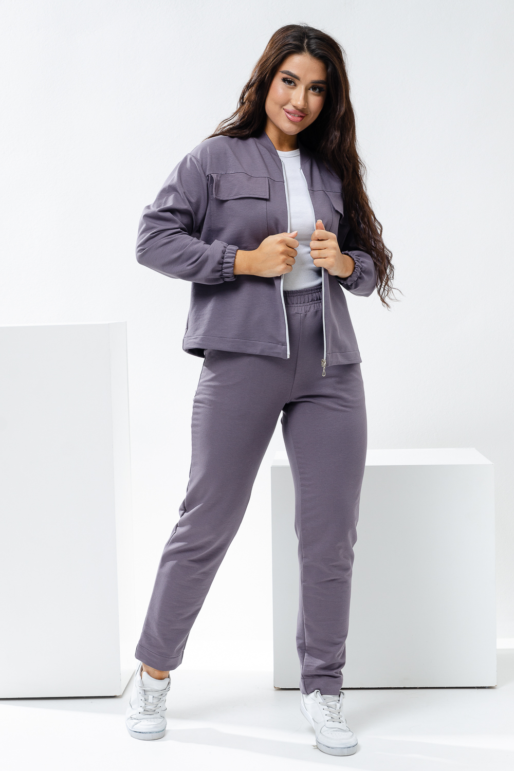 Костюм женский из футера двух нитки. Костюм состоит из курточки и брюк. Брюки с боковыми карманами и на притачном поясе. Курточка с длинным рукавом . Полочка застегивается на молнию. На полочке расположена кокетка и накладные карманы с клапанами. Низ изделия фиксируется резинкой. Низ рукавов на резинке.