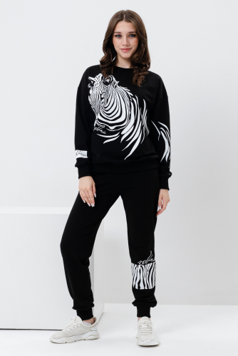 Женский костюм с брюками и толстовкой. Материал футер 2-х нитка с лайкрой. По все длине брюк и толстовки печать. Толстовка с манжетами, по низу брюк резинка.