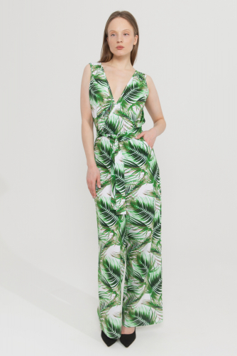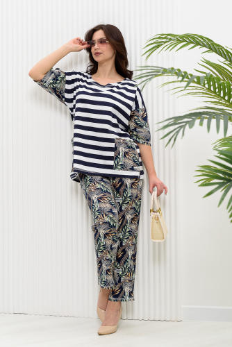 Костюм с брюками и кофтой. Кофта свободного кроя, с разрезами в боковых швах. Спинка удлиненная. Брюки прямого кроя с карманами.
