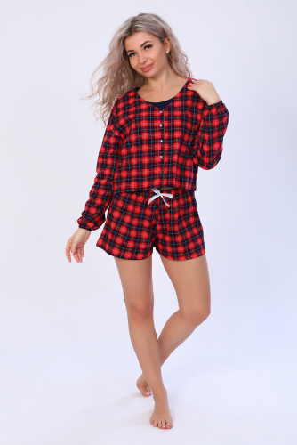 Женский костюм 3-ка из 100% хлопчатобумажного полотна в клетку - это идеальный вариант поднять настроение себе и окружающим! Стильный домашний комплект с брюками - незаменимая вещь в гардеробе каждой модницы. Костюм состоит из рубашки, майки и брюк палаццо. Рубашка с V-образным вырезом, длинным рукавом на резинке и застёгивающаяся на современные кнопки. Майка классическая, однотонная, без рукава. И конечно брюки палаццо успешно конкурирующие с другими моделями. Пояс брюк выполнен на специализированной поясной машине, по бокам имеются вместительные карманы. Комплект хорошо садится на любую фигуру, удобный крой позволяет чувствовать себя свободно, а всеми любимая расцветка придаёт образу лёгкость и романтичность.