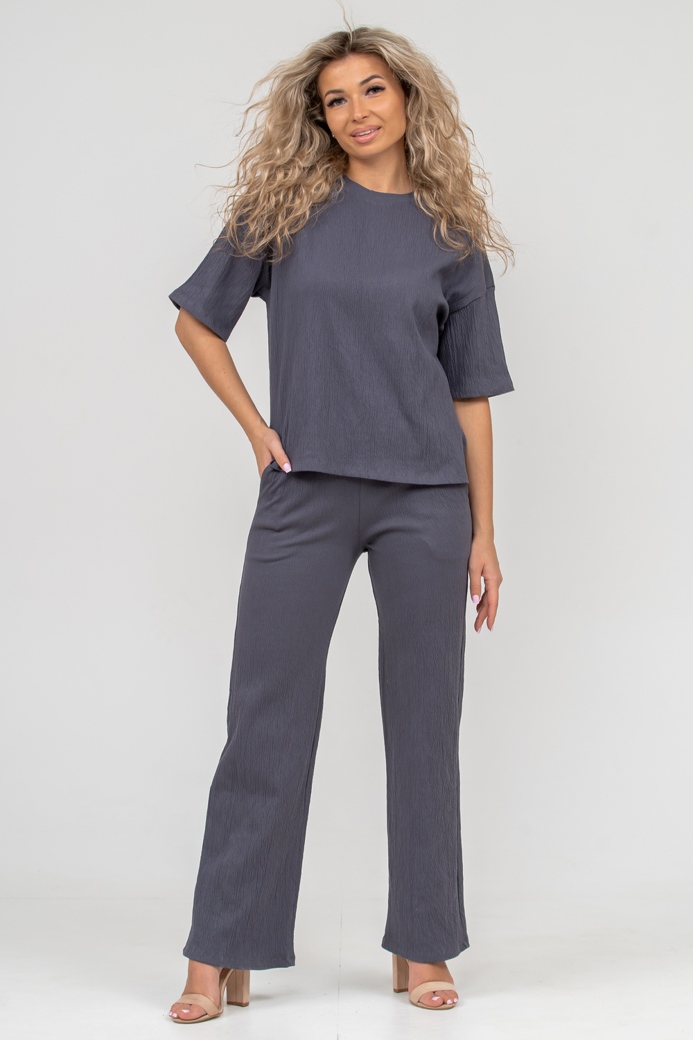 Модный стильный костюм - идеальное решение для тех, кто ищет лёгкую и красивую одежду на каждый день. Костюм, футболка и брюки, выполнен из кулирки гипе жатка компакт. Жатка - это ткань с мятой структурой, декоративными заломами и складками. Имеет много положительных качеств: хорошо тянется, упругая, красивая текстура, неприхотливая в уходе, прочная, износостойкая, не мнётся, не нуждается в глажке и приятная к телу. Футболка выполнена со спущенным рукавом, отстроченной обтачкой по горловине и двумя небольшими разрезами по бокам. На брюках имеется два вместительных боковых кармана и пояс, обработанный на специализированной поясной машине. Данная модель костюма очень удобна в качестве повседневной одежды, а универсальный фасон хорошо скроет недостатки и подчеркнет достоинства фигуры. Свободный крой комплекта двойки не сковывает движения, что делает его очень удобным в носке, резинка не перекручивается, а высокая посадка брюк - палаццо даёт ощущение комфорта. Такой костюм можно использовать как в качестве костюма для фитнеса, так и как вариант домашнего костюма, в нем также можно поехать на дачу или отправиться на вечернюю прогулку. Однотонный дизайн летнего брючного костюма без принта, надписей и декоративных элементов будет гармонировать с любым стилем одежды, а дополнить образ с модным костюмчиком можно любимыми аксессуарами и украшениями. Свободную футболку и брючки можно носить как вместе, так и отдельно. Футболку с коротким рукавом и разрезами по бокам можно легко сочетать с джинсами, юбками и шортами. К брюкам с карманами можно также подобрать любой верх. Образ с костюмом можно дополнить кроссовками, кедами или туфлями. Мягкий, прочный, хлопковый материал не дает усадку, не теряет форму после стирки и не линяет, его можно стирать в режиме бережной стирки при 30 градусах. Также данный трикотажный костюм не скатывается и не вытягивается за счет небольшого количества полиэстера в составе. Такой однотонный костюм с широкими брюками подойдет для разной возрастной категории. Он идеально подойдет для беременных и мам с детьми. Хорошо сядет на высоких и невысоких представительницах прекрасного пола всех возрастов. Такой универсальный прогулочный женский костюм станет отличным подарочным вариантом, его можно подарить маме, дочери, жене, бабушке, подруге или порадовать себя любимую даже без повода. Наш костюм благодаря своей практичности и лаконичному дизайну будет служить Вам долгие годы.