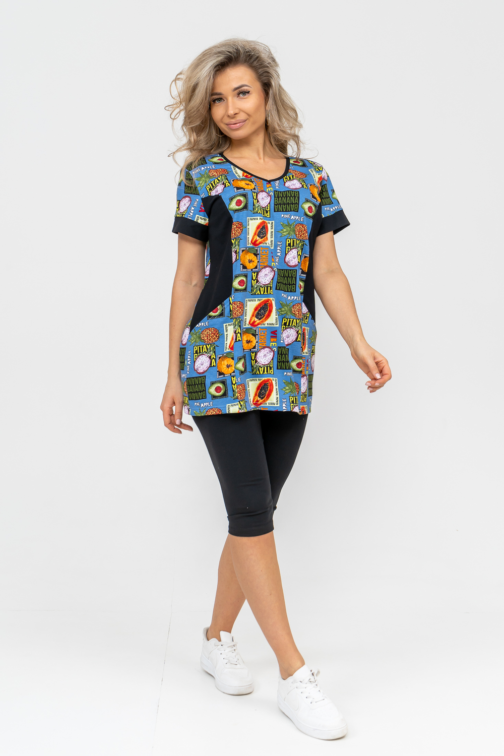 Женский костюм полуприлегающего силуэта состоит из туники и бриджей. 100% дышащий хлопок туники и эластичная вискоза бриджей несут в себе удобство при носке, гигроскопичность и износостойкость. V-образный вырез горловины придаёт изделию женственный вид. Для удобства туника имеет вместительные накладные карманы и втачные рукава с манжетами. Рельефы на полочке изделия создают идеальную посадку и безупречный внешний вид. Бриджи на резинке с высокой посадкой. В костюме такого плана Вы будете чувствовать себя комфортно как дома, так и на любимой даче. Эта двойка идеально подойдет для летнего отдыха на даче, на море или просто для девушек, которые хотят чувствовать себя уютно и комфортно дома. Летний женский костюм подходит для поездок и путешествий, загородного отдыха на природе, а также для получения лечения в больнице или санатории. Повседневное хлопковое изделие с бриджами - отличная идея для подарка любимой жене, маме, сестре или подруге на день рождения, 8 Марта или по любому другому приятному поводу. Рекомендация: для того чтобы продлить яркую жизнь Вашему костюму для дома и отдыха из хлопка, стирку производить при температуре не выше 30 градусов, а во избежание деформации изделия не прибегать к ручному отжиму (не перекручивать), утюжить слегка недосушенное изделие утюгом на паровом режиме. Покупайте наши красивые и удобные домашние костюмы с бриджами и носите с удовольствием! Приятных покупок!