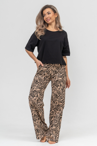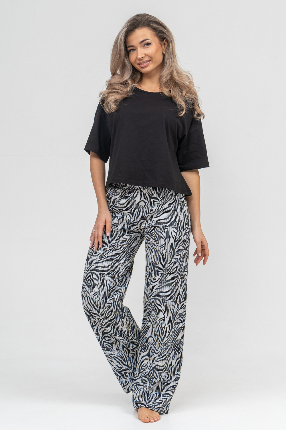 Модный стильный костюм - идеальное решение для тех, кто ищет лёгкую и красивую одежду на каждый день для дома и отдыха. Костюм, футболка и брюки, выполнен из 100% хлопка. Футболка выполнена со спущенным рукавом и окантованной горловиной. На брюках имеется два вместительных боковых кармана и пояс, обработанный на специализированной поясной машине. Данная модель костюма очень удобна в качестве повседневной одежды, а универсальный фасон хорошо скроет недостатки и подчеркнет достоинства фигуры. Свободный крой комплекта двойки не сковывает движения, что делает его очень удобным в носке, резинка не перекручивается, а высокая посадка брюк - палаццо даёт ощущение комфорта. Такой костюм можно использовать как вариант домашнего костюма, в нем также можно поехать на дачу или отдых. Свободную футболку и брючки можно носить как вместе, так и отдельно. Футболку с коротким рукавом можно легко сочетать с джинсами, юбками и шортами. Хлопковый материал можно стирать в режиме бережной стирки при 30 градусах. Такой костюм с широкими брюками подойдет для разной возрастной категории. Он идеально подойдет для беременных и мам с детьми. Хорошо сядет на высоких и невысоких представительницах прекрасного пола всех возрастов. Такой универсальный женский костюм станет отличным подарочным вариантом, его можно подарить маме, дочери, жене, бабушке, подруге или порадовать себя любимую даже без повода. Наш костюм благодаря своей практичности и лаконичному дизайну будет служить Вам долгие годы. Можно также приобрести брюки отдельно - модель 36901.