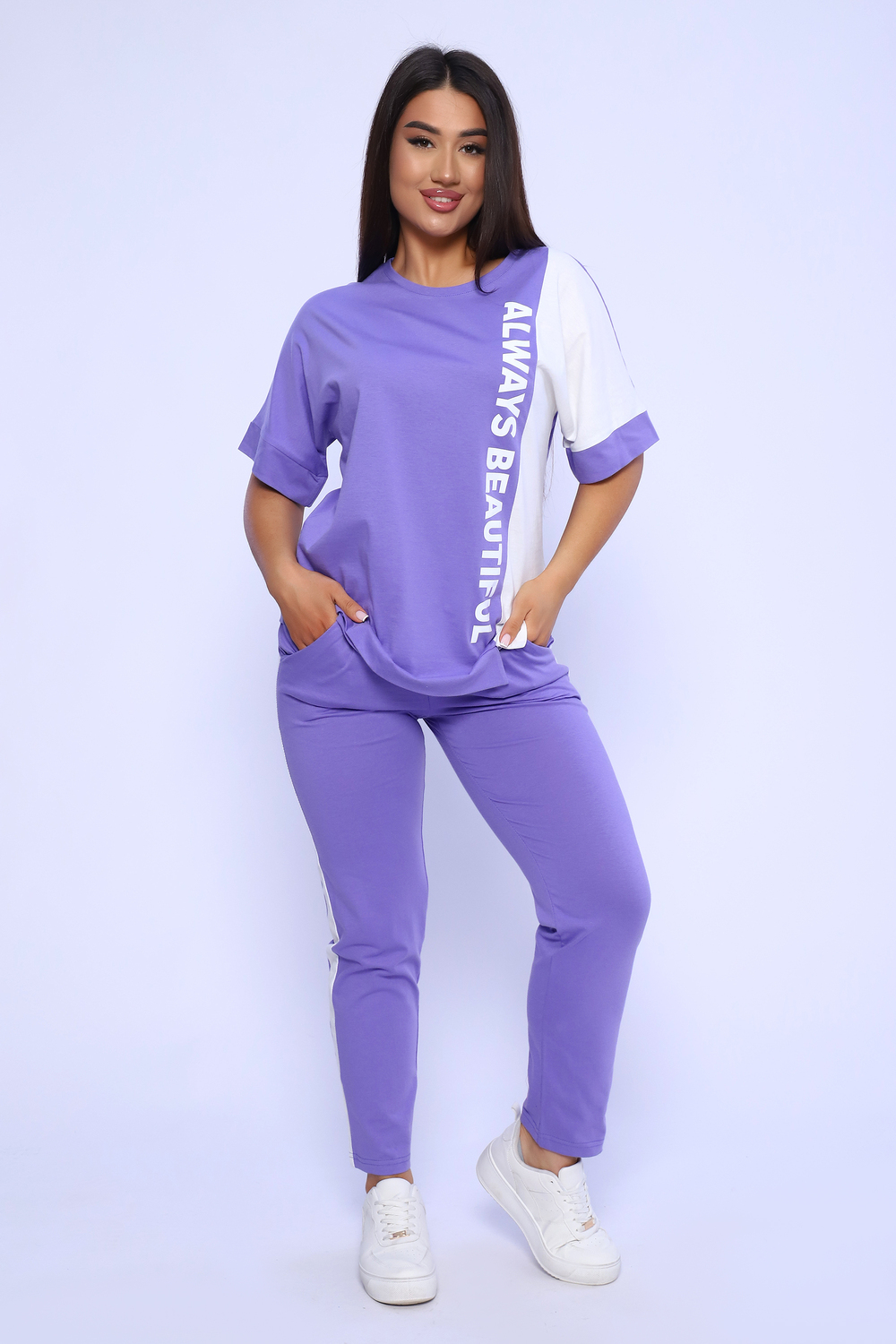 Эффектный костюм в спортивном стиле из трикотажного полотна ярких оттенков. В комплекте представлена кофта свободного кроя со спущенным рукавом и узкие, но не обтягивающие брюки. Изюминкой костюма является сочетание контрастных цветов в дизайне кофты в виде крупных латинских букв и целых вставок. Трикотажные костюмы стали одним из самых популярных и востребованных атрибутов в гардеробе современных женщин, так как не только подчеркивают стиль и индивидуальность, но и обеспечивают комфорт и удобство в повседневной жизни.