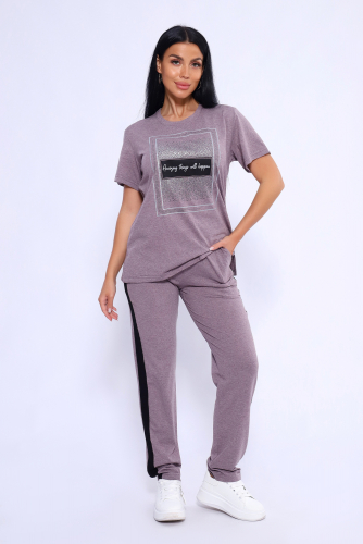 Классический и удобный трикотажный костюм с брюками из легкой хлопковой ткани! В комплекте костюма представлены кофта свободного кроя и брюки универсальной посадки с лампасами по бокам. Кофта украшена лаконичным принтом. Костюм - идеальный вариант домашней одежды для женщин, также прекрасно подойдет и для повседневной носки.