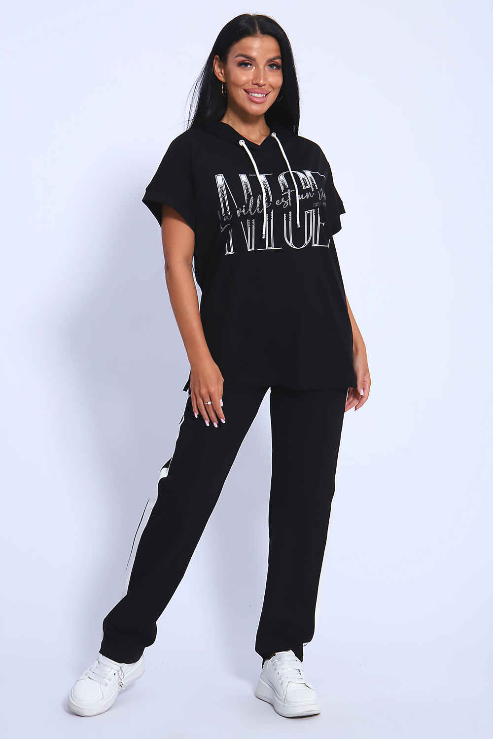 Классический и удобный трикотажный костюм с брюками из 100%-го хлопка! В комплекте костюма представлены кофта свободного кроя с капюшоном и брюки c тонкими лампасами универсальной посадки. Кофта украшена ярким принтом, состоящим из крупных латинских букв, контрастирующими с общим фоном изделия. Костюм - идеальный вариант домашней одежды для женщин, также прекрасно подойдет и для повседневной носки, прогулок и занятий спортом.