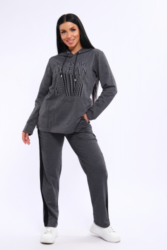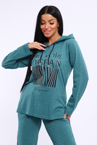Мягкий и уютный женский костюм для дома, изготовленный из высококачественного, приятного телу трикотажного полотна, состоящего на 50% из хлопка. Комплект представлен в трех расцветках. На полочке кофты имеется принт, придающий изделию особый шарм. Дополнительным декором кофты служит капюшон. По бокам брюк расположены лампасы из ткани контрастного цвета. Костюм красиво сидит на фигуре, подчеркивает ее достоинства и при этом не стесняет движений. В нем Вы будете чувствовать себя комфортно и уверенно.