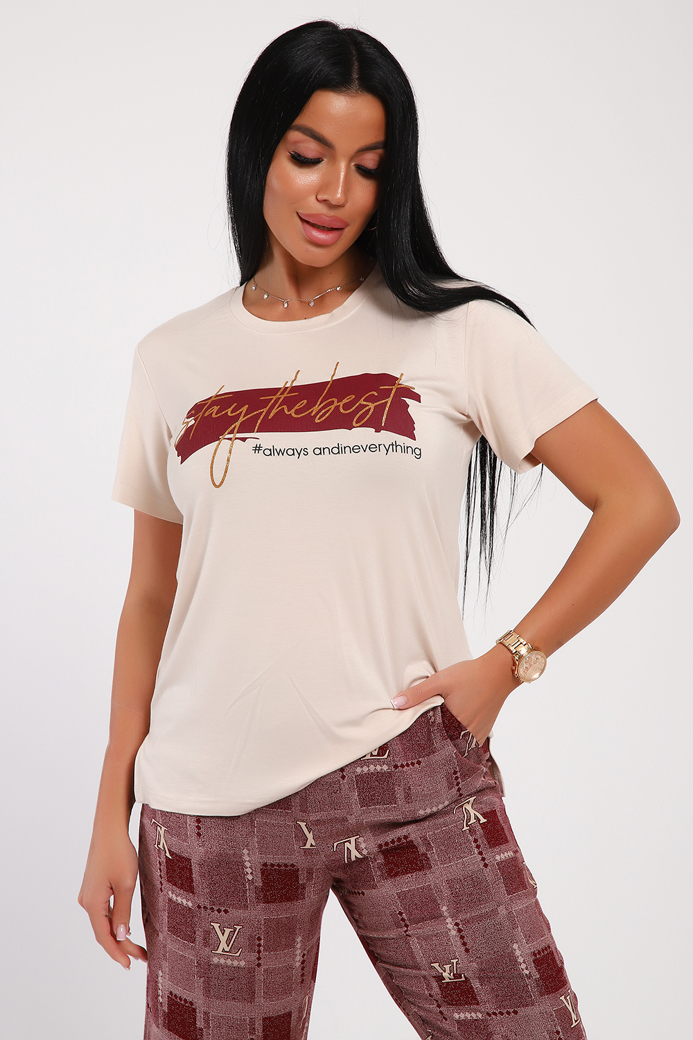 Классический и удобный трикотажный костюм с брюками из легкой хлопковой ткани динамичной расцветки! В комплекте костюма представлены кофта свободного кроя и брюки универсальной посадки Изюминкой костюма служит контраст верхи и низа -кофта нежного кремового оттенка и украшена лаконичным принтом, в тон расцветки брюк, которые сшиты из яркой, многоцветной ткани. универсальность костюма в том, что это идеальный вариант как домашней одежды для женщин, так и прекрасно подойдет для повседневной носки или одежды для сна.