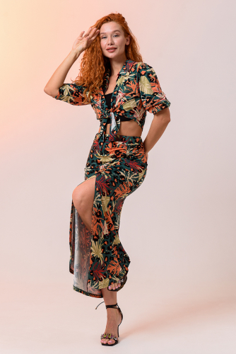 Костюм летний женский состоит из юбки и топа прилегающего силуэта. Выполнен из качественного мягкого материала хорошей растяжимости не сковывает движения. Топ укороченный с коротким рукавом и глубоким вырезом горловины. По центру полочки походит эластичная тонкая резинка, которой вы сможете отрегулировать желаемую длину топа и драпировку.