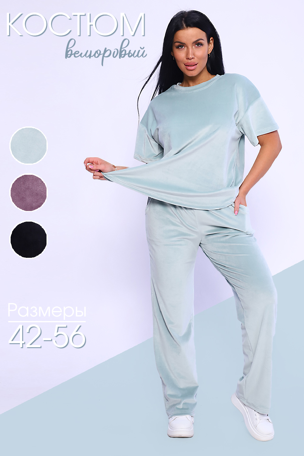 Костюм женский велюровый, повседневный, всесезонный. Костюм состоит из футболки и брюк. Футболка оверсайз прямого силуэта, длиной до бедра. Рукав втачной со спущенным плечом, длиной чуть выше локтя. Горловина с обтачкой, низ футболки с подгибкой. Брюки прямого силуэта, умеренного объема. На передних половинках брюк карманы с отрезным бочком. Пояс притачной с эластичной тесьмой. Низ брюк подгибка. Замеры объема талии брюк по нерастянутой резинке.