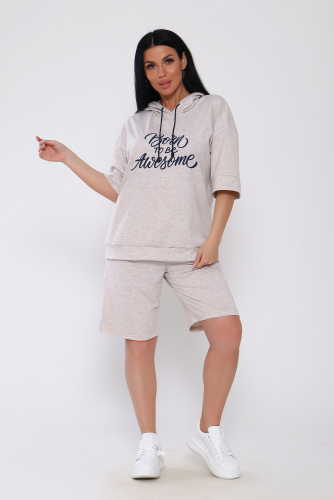 Костюм с шортами из кулирки с лайкрой. Кофта свободная с капюшоном с люверсами и шнурком. По переду принт ,рукав короткий на манжете, длинна до бедра .Шорты свободного покроя с карманами, длина до колена. На модели размер 48-50.Шнурки от партии могут отличаться. Размеры сдвоены.