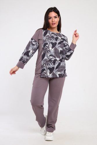 Комплект состоит из туники и брюк. Туника прямого силуэта, с V-образной горловиной, с удлиненной спинкой, с разрезами в нижней части боковых швов. Рукав короткий. Горловина обработана бейкой из основного полотна. Брюки длинные, с карманами, с кокеткой сзади, на эластичном поясе. Низ брюк на резинке.
