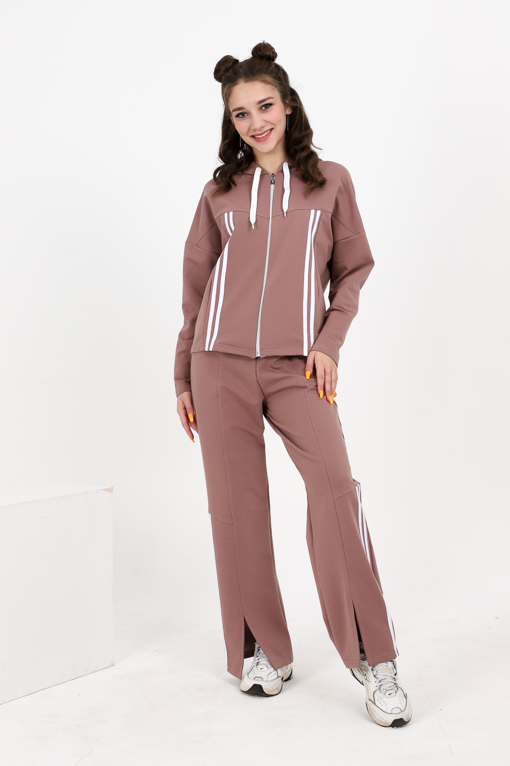 Костюм состоит из толстовки и брюк. Толстовка прямая, свободная, с капюшоном, на молнии. Полочка с кокетками и вертикальными рельефами. В рельефных швах обработаны карманы. Рукав длинный. Низ спинки обработан поясом. Брюки свободные, прямые, с боковыми карманами, на поясе. В нижней части передних половинок брюк обработаны разрезы.