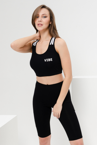 Комплект состоит из топа и шорт-велосипедок. Топ на тонких бретелях, с округлой горловиной на полочке. Вдоль боковых швов на полочке расположены отделочные лампасы. В верхней части спинки расположены перекрещенные бретели. Верх спинки собран на резинку. Горловина, проймы и бретели обработаны бейкой из основного полотна. Шорты облегающие, длинной выше колена, с завышенной линией талии, сверху на широком эластичном поясе.