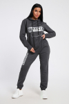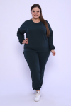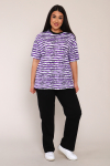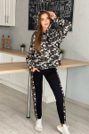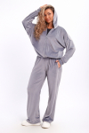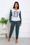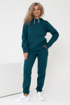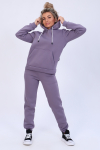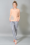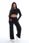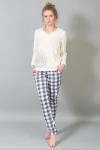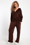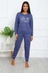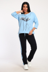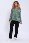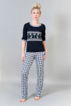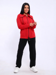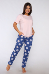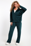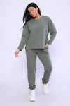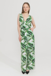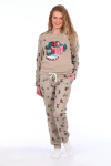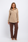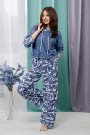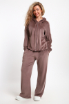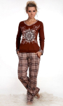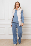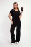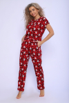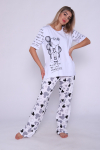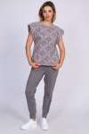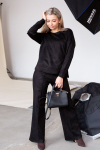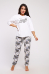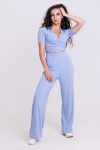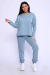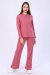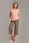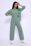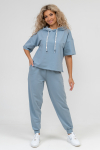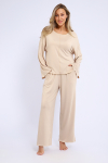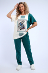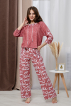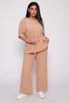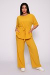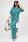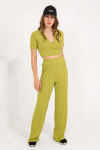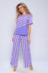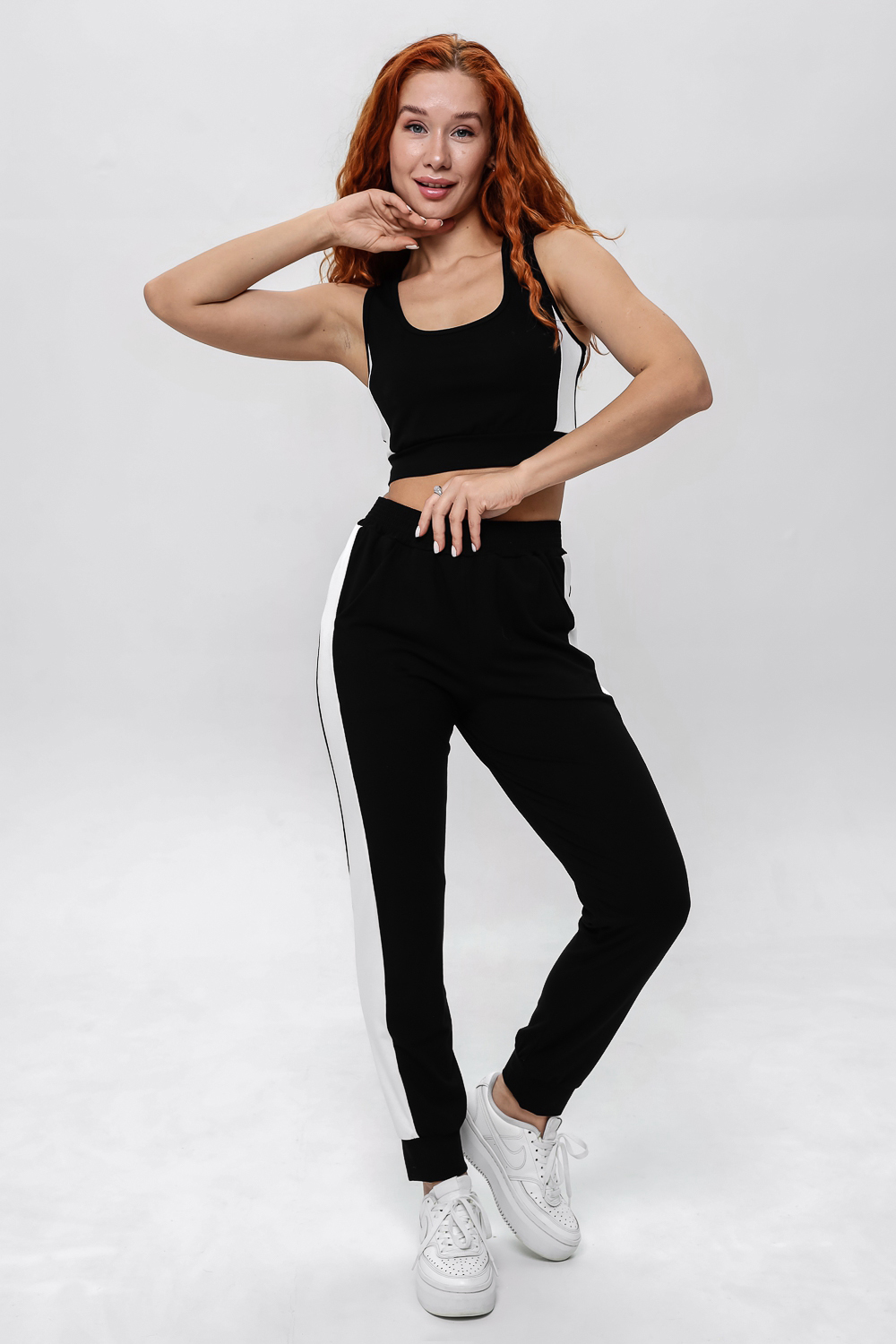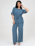 Комплект состоит из топа и брюк. Топ на узких бретелях, с округлой горловиной на полочке и вырезом борцовка сзади. В верхней части спинки расположена фигурная кокетка и декоративным вырезом. Горловина, проймы и вырез на спинке обработаны бейкой из основного полотна. Брюки на поясе, с боковыми карманами, с лампасами из отделочного полотна вдоль боковых швов, с манжетом.