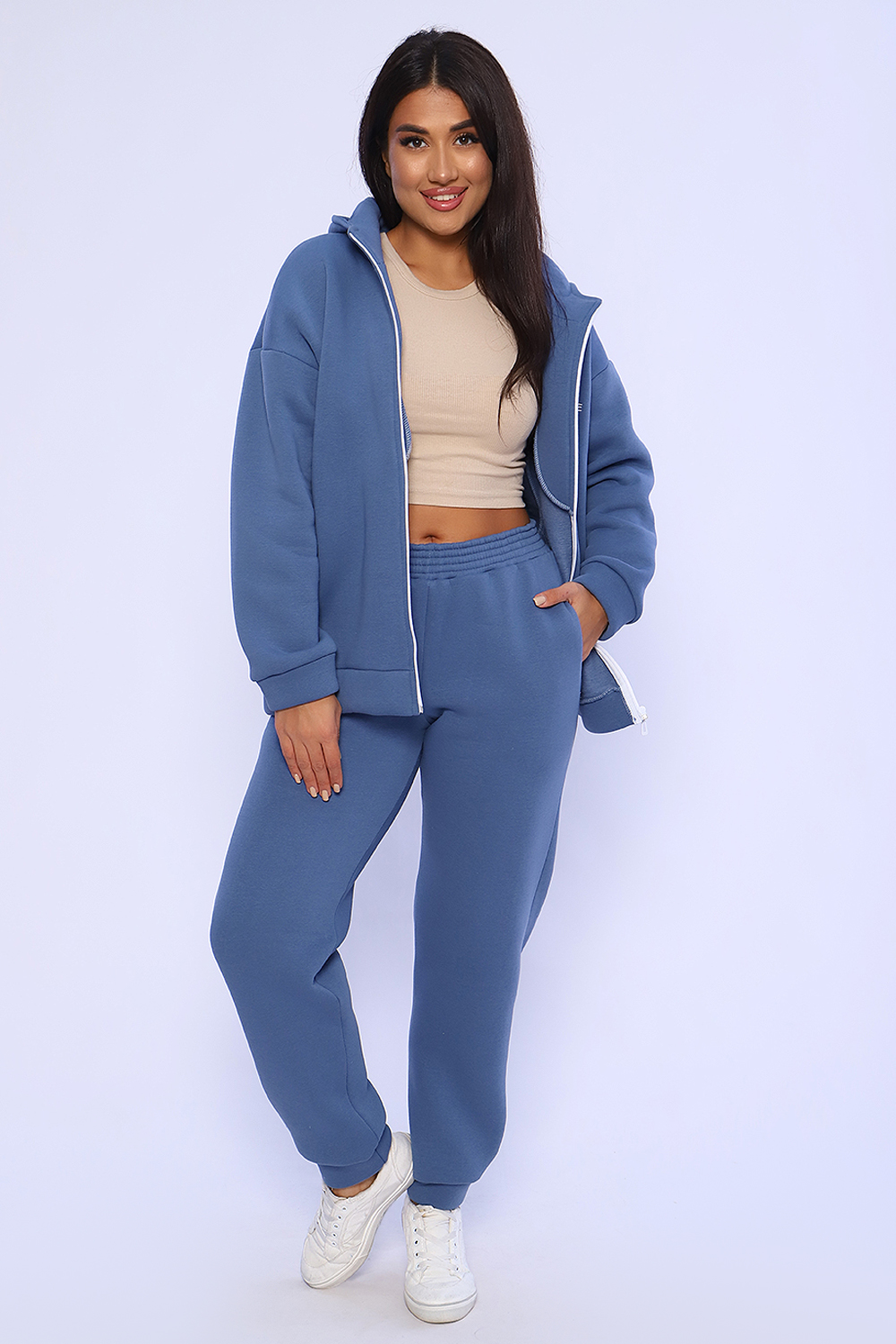 Женский костюм из футера 3-х нитки с начесом. Костюм состоит из толстовки и брюк. Толстовка свободная на молнии с капюшоном, на полочке оригинальная вышивка Lady HOME, по боковому шву в шве карман. Толстовка со спущенным рукавом на манжете. Брюки свободные. По боковому шву карман в шве, низ брюк на манжете. Пояс обработан на поясной машине, что делает брюки практичными при носке резинка не скручивается. Костюм теплый, удобный, комфортный. Идеальное решение для повседневной носки в прохладную погоду!