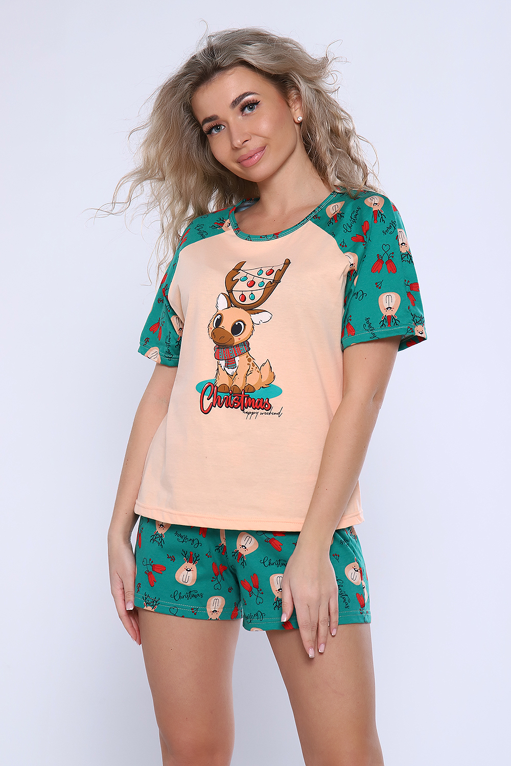 Костюм домашний состоит из футболки и шорт. Футболка с короткими рукавами реглан и принтом. Удобный и практичный вариант для дома и сна.
