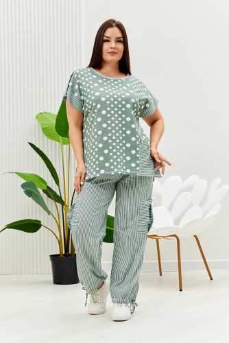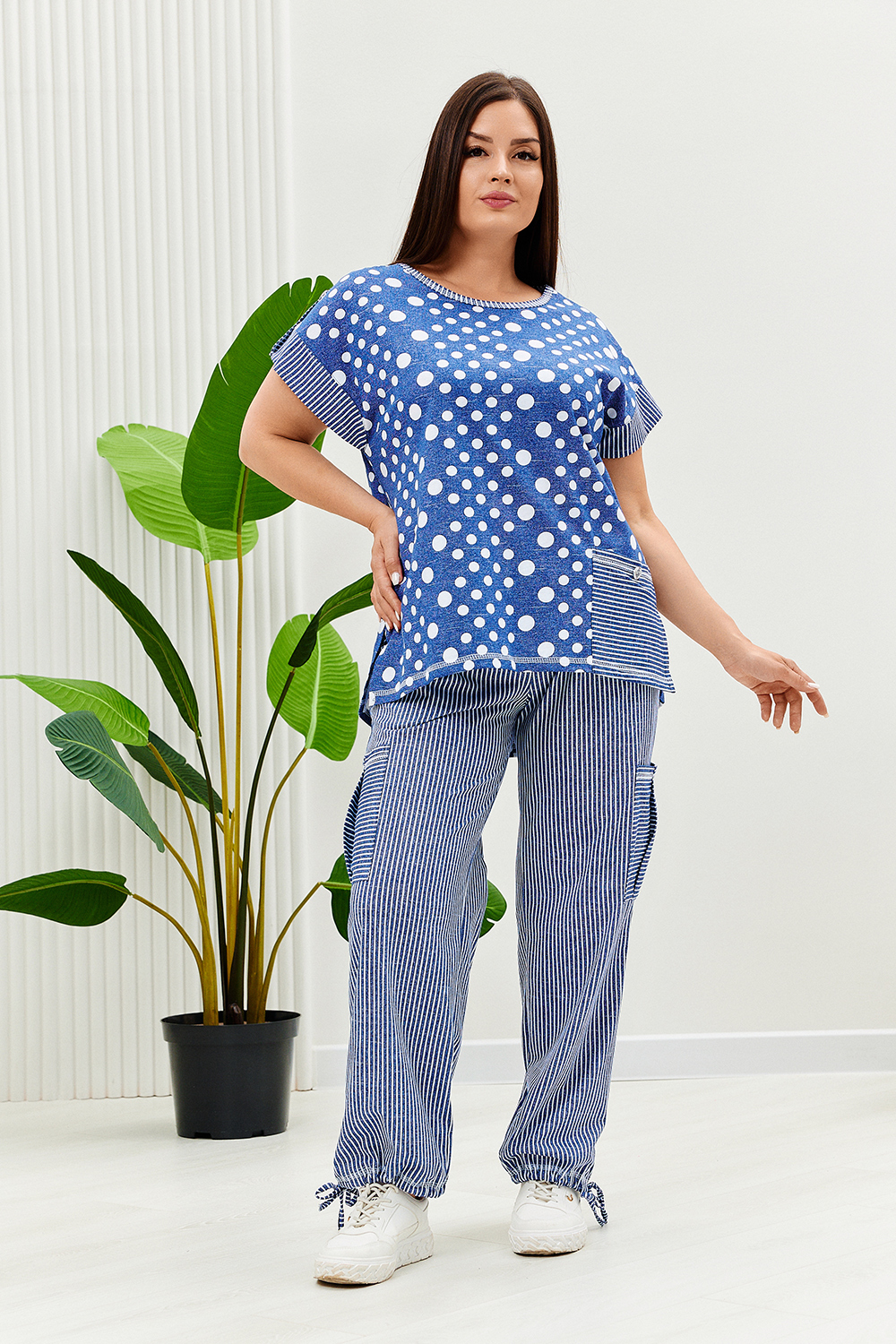 Костюм женский, туника и брюки. Туника прямого силуэта. Вырез горловины округлый. Рукав цельнокроенный короткий. С одной стороны на полочке сбоку накладной карман. Брюки в полоскупрямого силуэта, внизу брюк разрезы и утяжки. На передних частях внутренние карманы и боковые с бантовой складкой. Пояс выполнен на многоигольной машине.