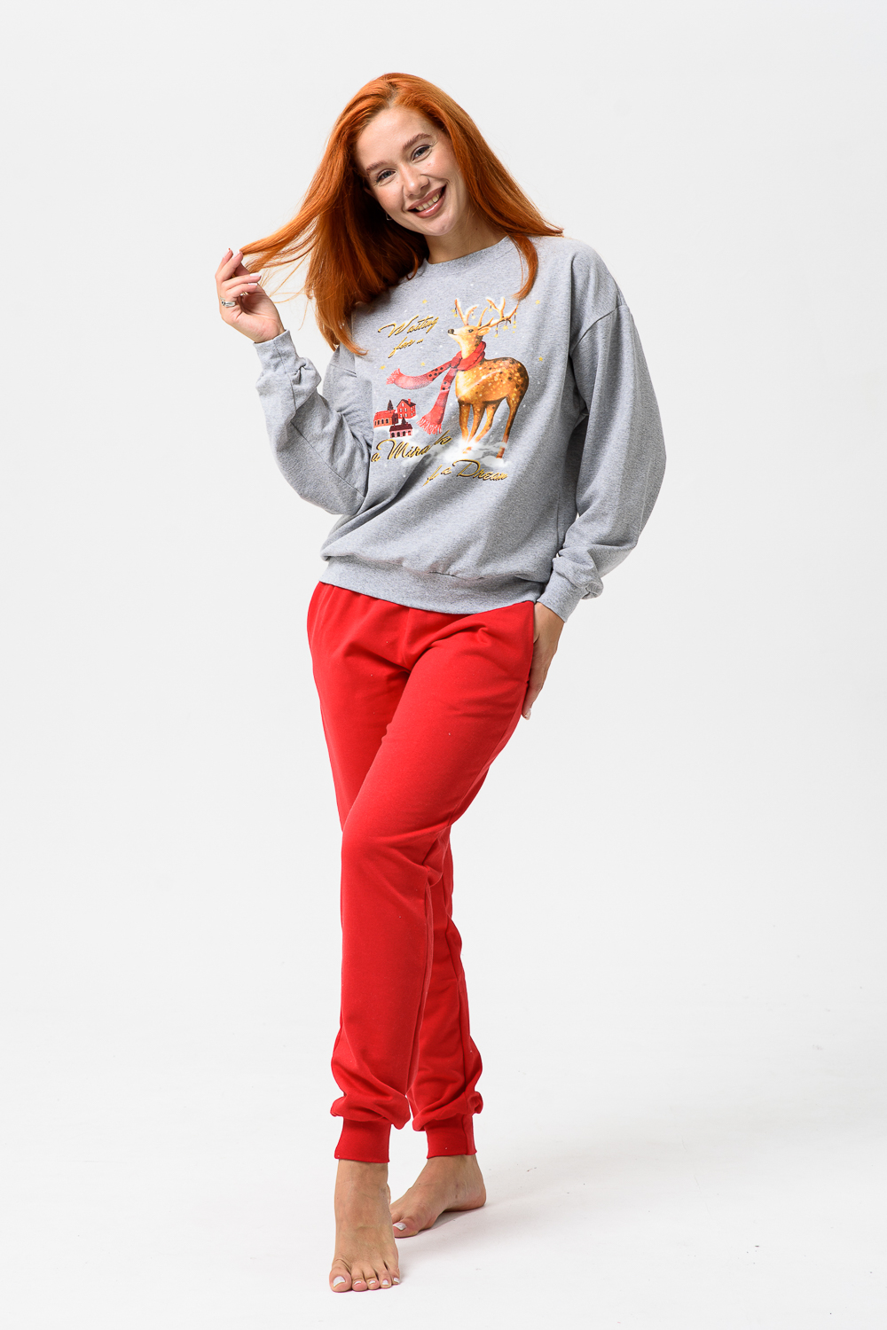 Олени - неотъемлемый атрибут Рождества. Традиция использовать в новогоднем убранстве рождественских оленей завоевала большую популярность во всём мире. В этом уютном удобном костюме из футера 2х нитки с начёсом комфортно находиться в домашней обстановке. В нём можно встретить праздник и использовать в качестве подарка. Костюм состоит из свитшота свободного кроя и брючек с карманами в боковых швах. Все манжеты на костюме выполнены из плотной резинки - кашкорсе. Пояс обработан плотной резинкой 3см. После стирки может быть небольшая усадка, поэтому имеется напуск. Длина рукава в измерениях указана от основания шеи.