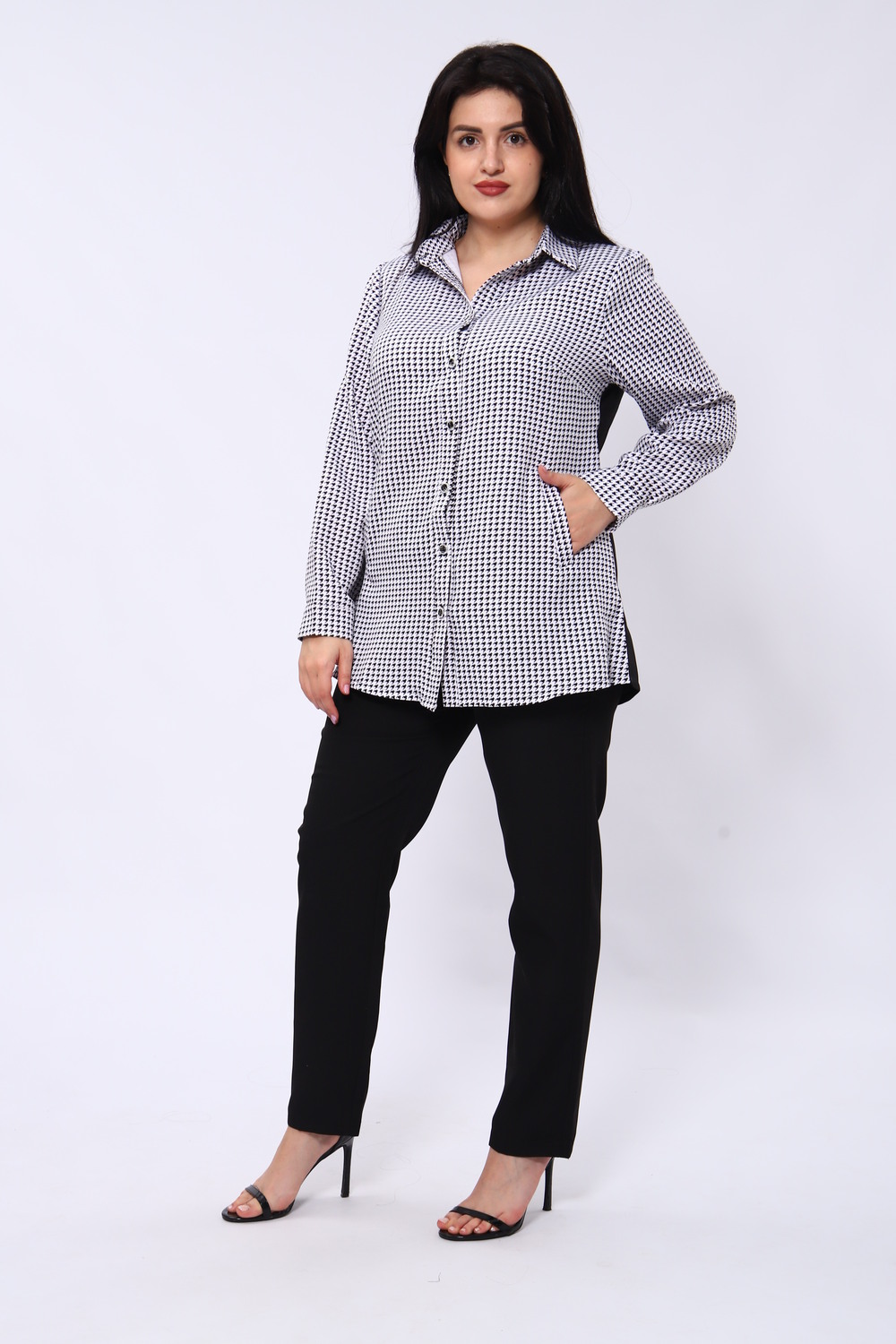 Женский костюм с брюками это незаменимый элемент современного гардероба, который сочетает в себе элегантность и комфорт. Если вы ищете идеальный наряд для офиса или деловых встреч, обратите внимание на наш костюм с брюками, состоящий из черных классических брюк и рубашки с рисунком гусиные лапки.