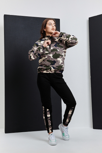 Костюм женский из мягкого, тонкого комбинированного футера . Свитшот с рельефами, в свободном стиле Oversize. Круглая горловина обработана обтачкой, спущенная пройма, длинный рукав, с надписью на передней полочке. На спинке кокетка, низ на широком манжете с декоративным шнуром. Брюки- трубы с лампасами и удобными карманами в боковых швах. Стильный, комфортный костюм идеальный вариант для повседневного гардероба.