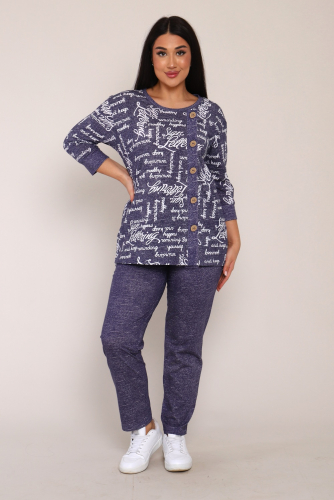 Костюм состоит из туники и брюк. Туника прямого силуэта, с округлой горловиной, длиной до середины бедра. Спинка с кокеткой, удлиненная. В нижней части боковых швов обработаны разрезы. Рукав короткий. Горловина обработана бейкой из основного полотна. Брюки на поясе, с боковыми карманами, с лампасами.