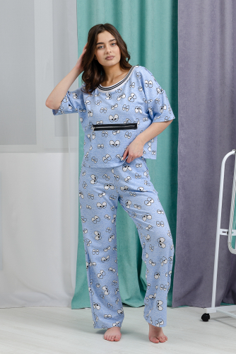Костюм состоит из туники и брюк. Туника с округлой горловиной, обработанной отделочной рибаной. На полочке расположен декоративный карман с молнией. Рукав короткий. Горловина спинки обработана бейкой из основного полотна. Брюки прямые, на поясе, с боковыми карманами.