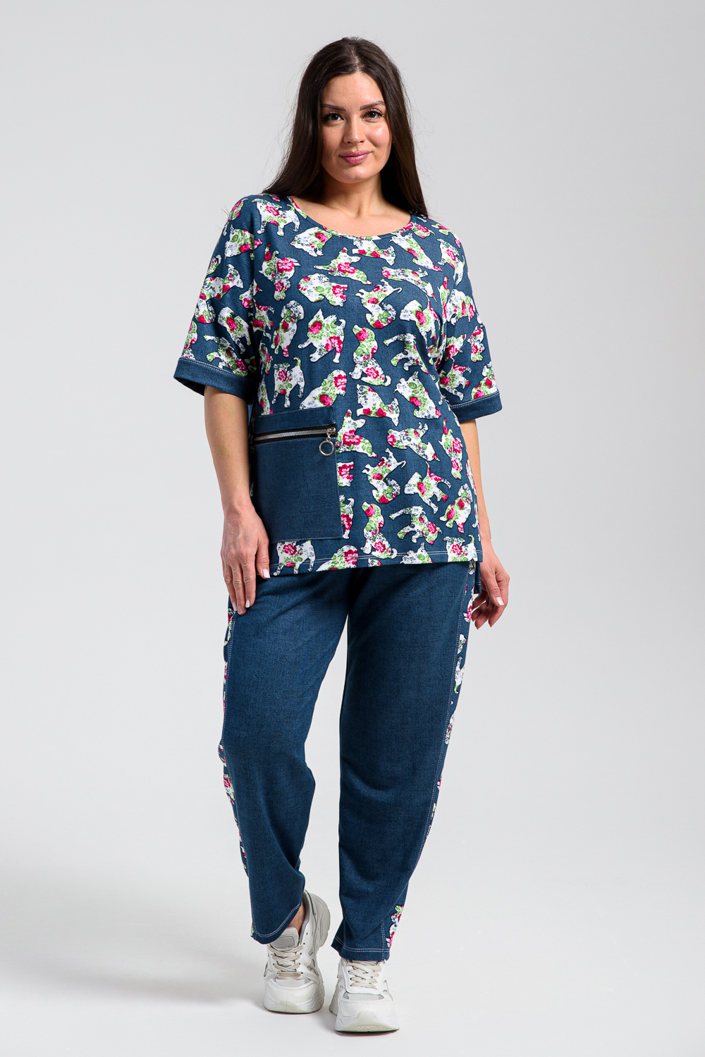 Костюм состоит из туники и брюк. Туника прямого силуэта, с округлой горловиной, длиной до середины бедра. Спинка с кокеткой и вертикальными рельефами, удлиненная. На полочке расположен накладной карман с молнией. В нижней части боковых швов обработаны разрезы. Рукав короткий, с манжетом. Горловина обработана бейкой из основного полотна. Брюки на поясе, с боковыми карманами, с лампасами из отделочного полотна.