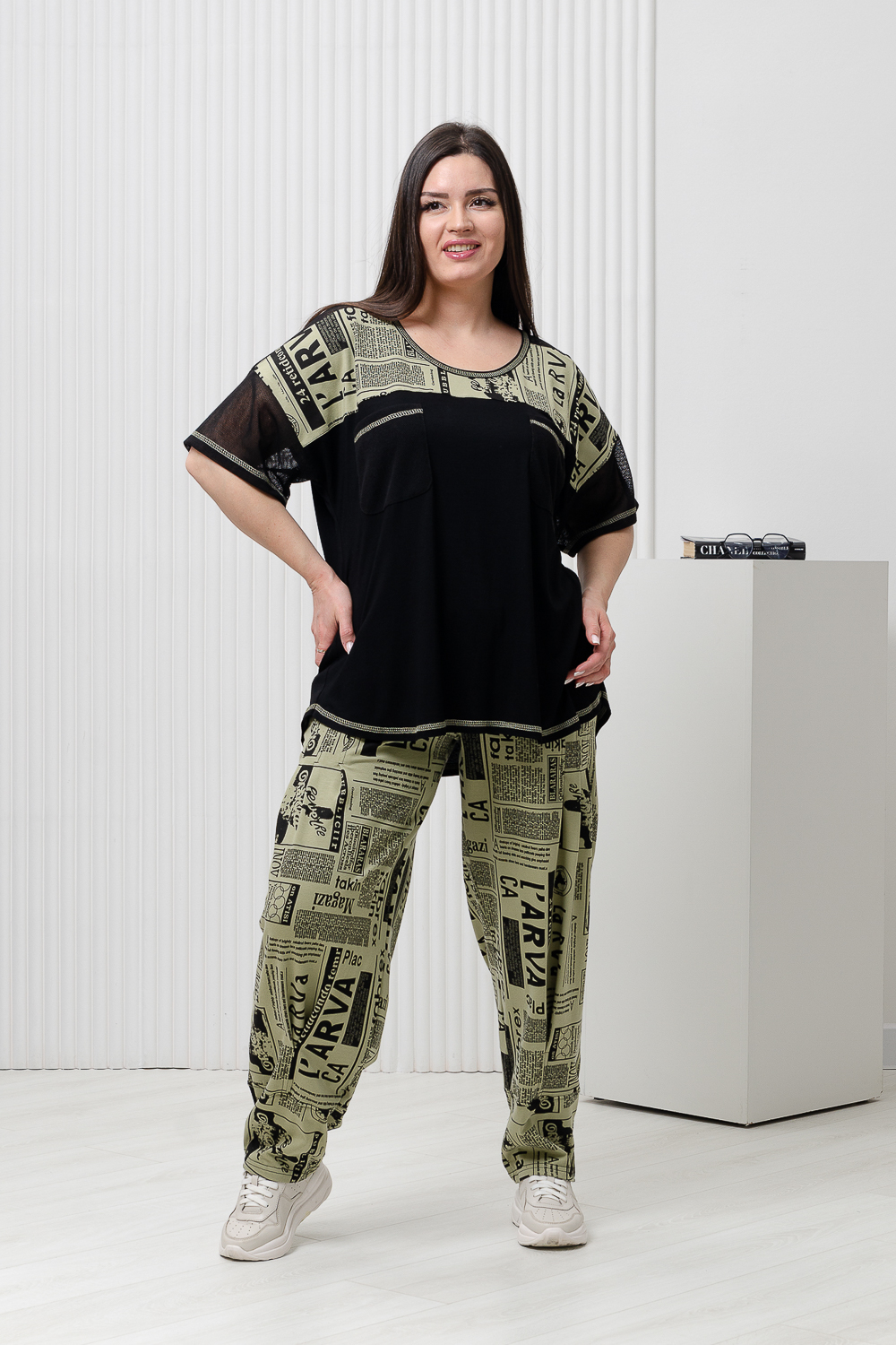 Костюм женский. Туника и брюки. Туника состоит из трех частей: цельнокроеная кокетка полочки и спинки из хлопковой сетки, средняя часть из набивной кулирки, нижняя часть туники выполнена из дышащей вискозы. На полочке накладные нагрудные карманы из сетки. Брюки бананы. Передние и задние части брюк из трех частей. В верхней передней части брюк внутренние карманы. В средней части брюк по три вертикальные складки. Конструкция брюк позволяет скрыть любые недостатки в области бедер.