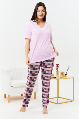 Пижама женская из кулирки 100% хлопок состоит из г/к футболки и брюк. Футболка нежного оттенка с V-образным вырезом, горловина и рукава обработаны красивым эластичным кружевом белого цвета. Брюки из набивной кулирки в клетку, могут быть с боковым швом. Пижама подходит для сна и дома, комфортная, удобная, не меняет цвет после стирки. Рост модели на фото 165см, размер 48