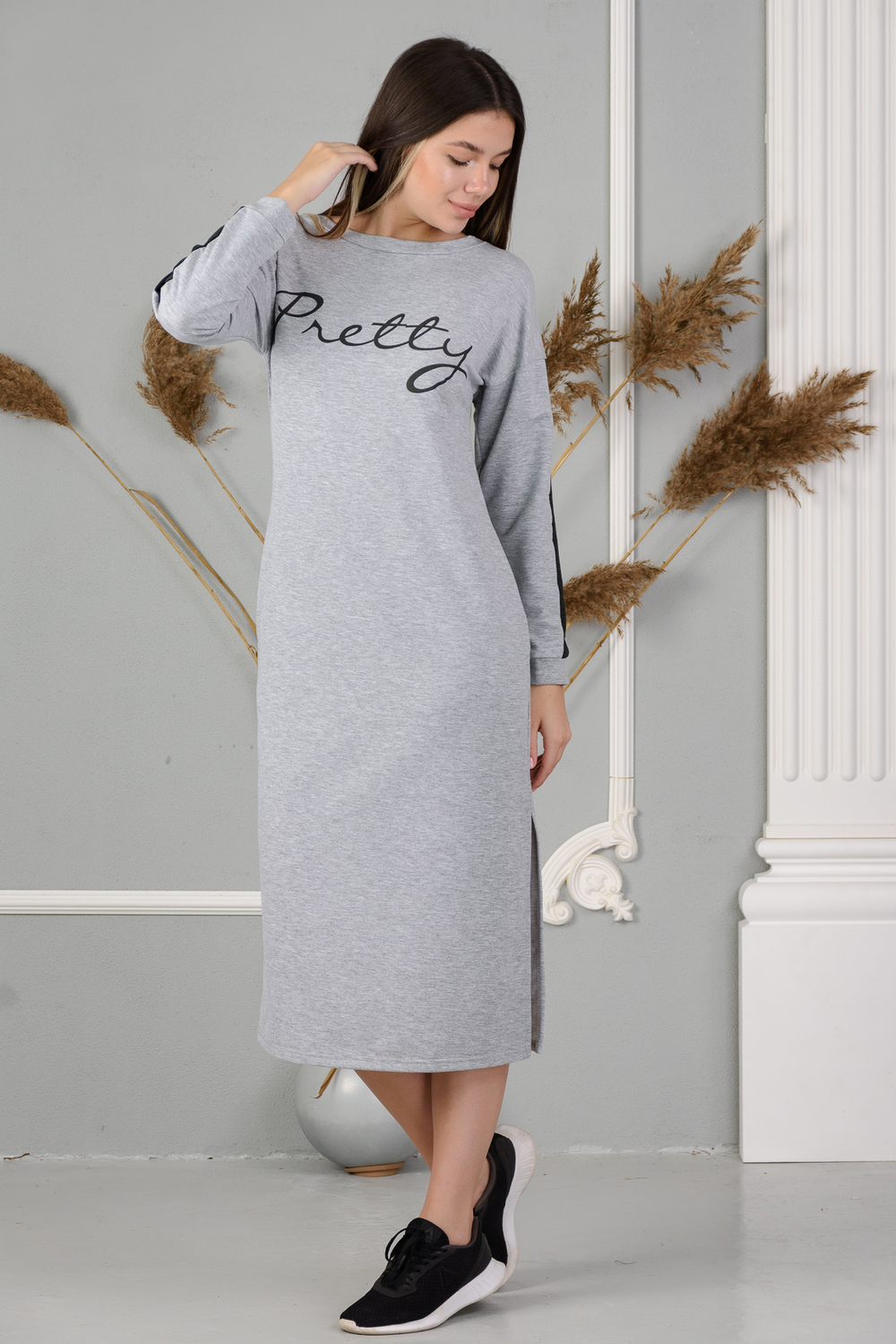 Платье с принтом в спортивном стиле, слегка приталенного силуэта, миди длиной, с разрезом снизу. Горловина в виде лодочки, обработана обтачкой, спущенная пройма, рукава с лампасами длинные на манжете, в боковых швах удобные карманы. Комфортное, практичное платье подойдёт для любой фигуры и возраста.