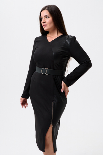 Изящное черное женское платье. Данная модель приталенная, выполнена в классическом стиле, рукав длинный, горловина v-образного выреза. Платье дополняют разрез снизу и молния над ним, вставка из эко-кожы и ремень на талии с круглой застежкой, что придает образу капельку дерзости. Такое платье послужит для любого повода, как деловое на работу, как вечернее и как праздничное. Изделие больше подходит для девушек с фигурой песочные часы.