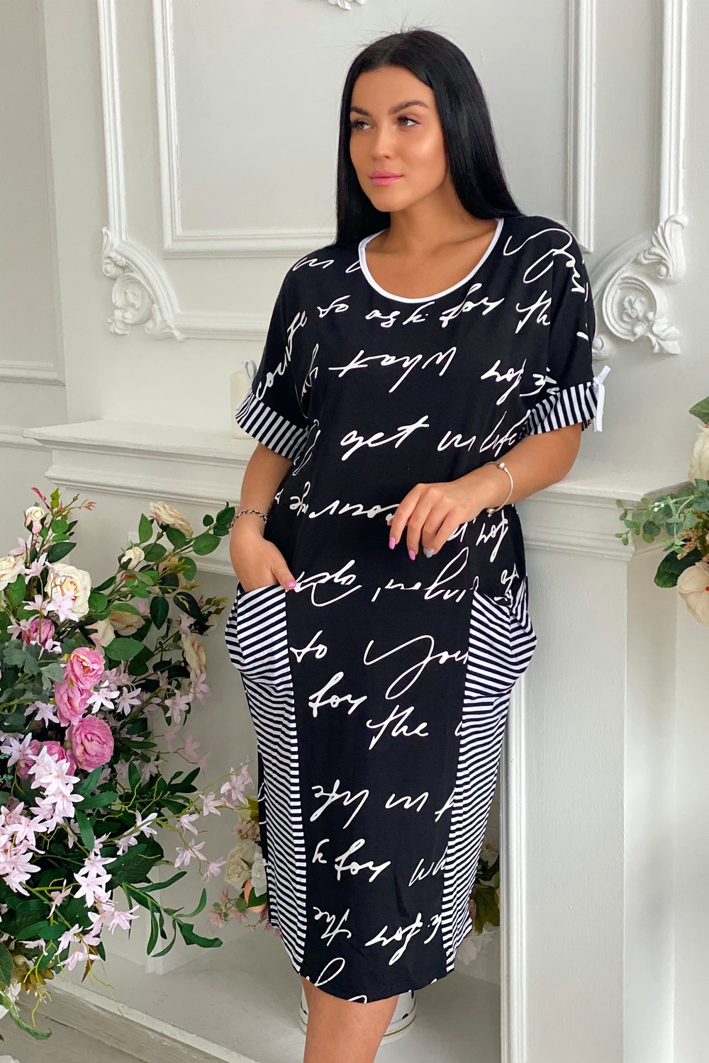 Платье женское полуприлегающего силуэта. Рукав цельнокроенный с манжетой. На полочке в горизонтальном шве внутренние карманы с небольшими складками. Оригинальность придают декоративные боковые вставки в нижней части платья и манжеты из ткани в полоску.