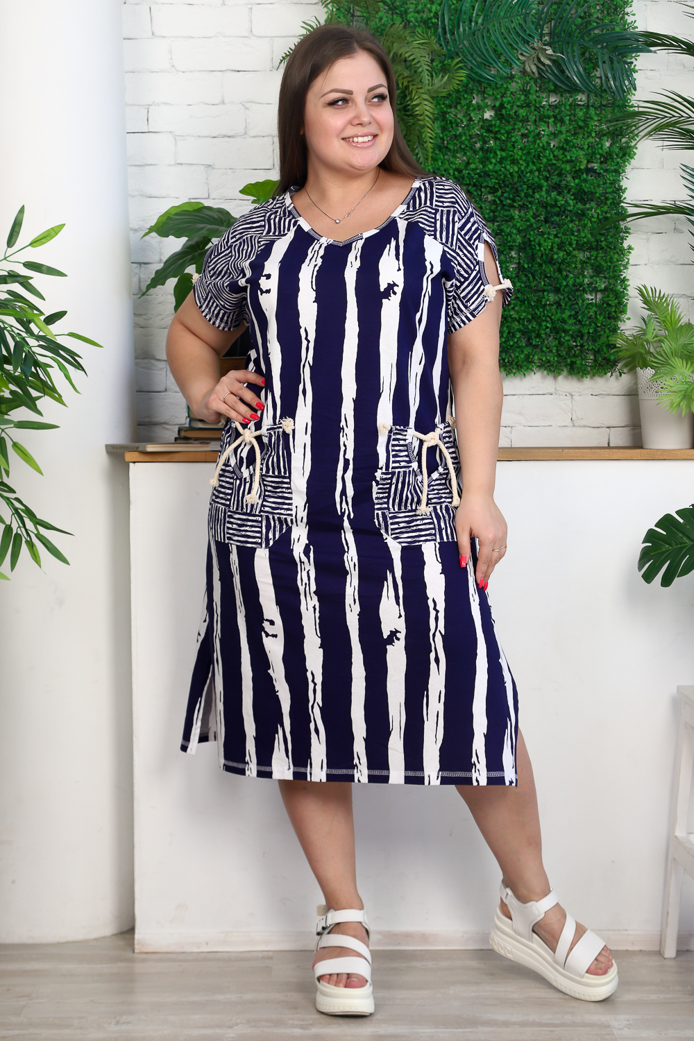 Платье женское полуприлегающего силуэта. Рукав цельнокроенный, спереди имитация реглана, сзади на спинке кокетка. На полочке накладные фигурные карманы, по боковым швам разрезы. Платье в морском стиле, этот образ подчеркнут благодаря использованию х/б шнура в кармане и рукаве, а также ткани в полоску с замечательным компаньоном клетка. На модели 52 размер. На фото платье из той же коллекции 9121