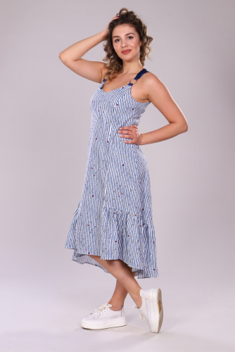 Сарафан на пуговицах полуприлегающего силуэта и V - образным вырезом горловины. По низу изделия волан на сборке. Карманы в боковых швах.