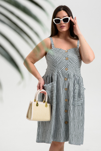 Сарафан женский на широких бретелях, отрезной по линии талии. Застежка на петли -пуговицы. В верхней части полочки и спинки рельефы. Нижняя часть сарафана имеет небольшую сборку по шву притачивания, два накладных кармана. Сарафан смотрится оригинально за счет подбора полосы в деталях под разным углом.