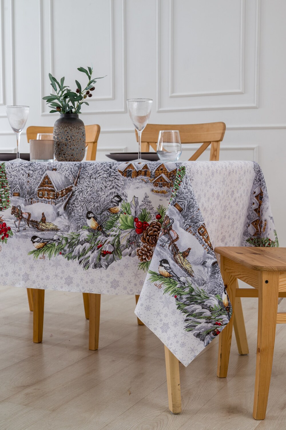 Изысканный дизайн: Белоснежная основа скатерти украшена деликатными серыми снежинками, создающими ощущение легкого морозного узора. В центре композиции очаровательные изображения лошадок, несущихся по заснеженным полям, и сцены веселых зимних забав. Этот узор пробуждает самые теплые воспоминания о детстве и дарит ощущение праздника.